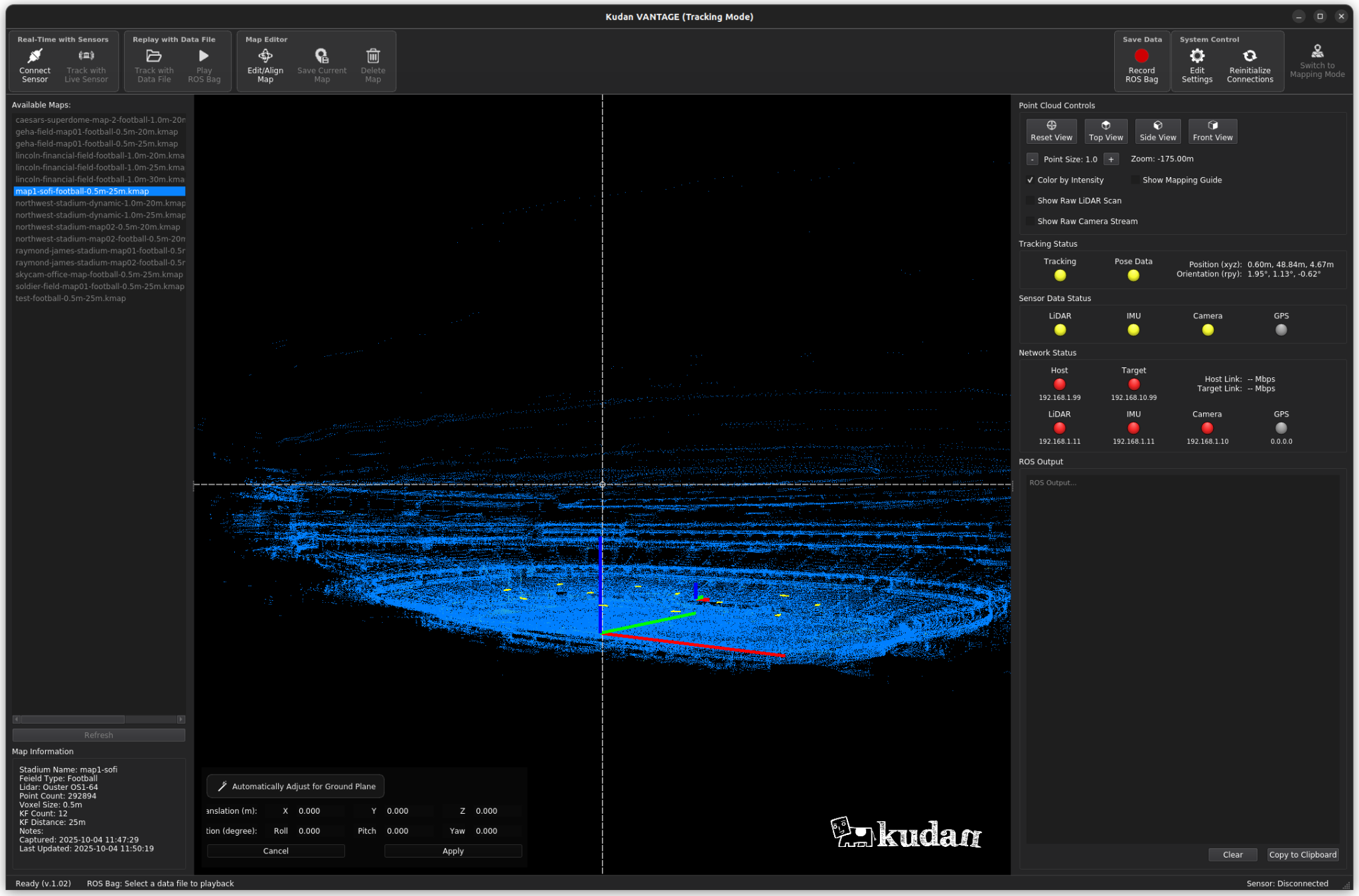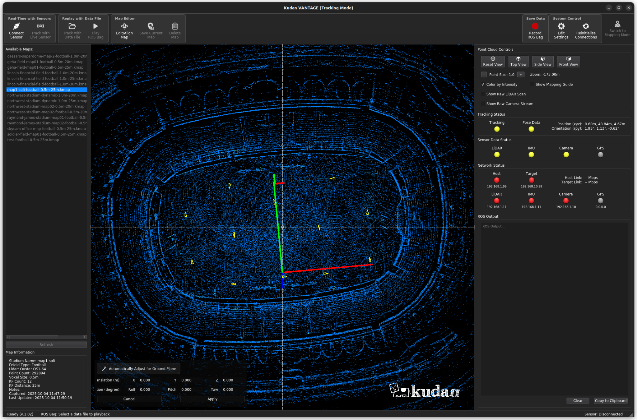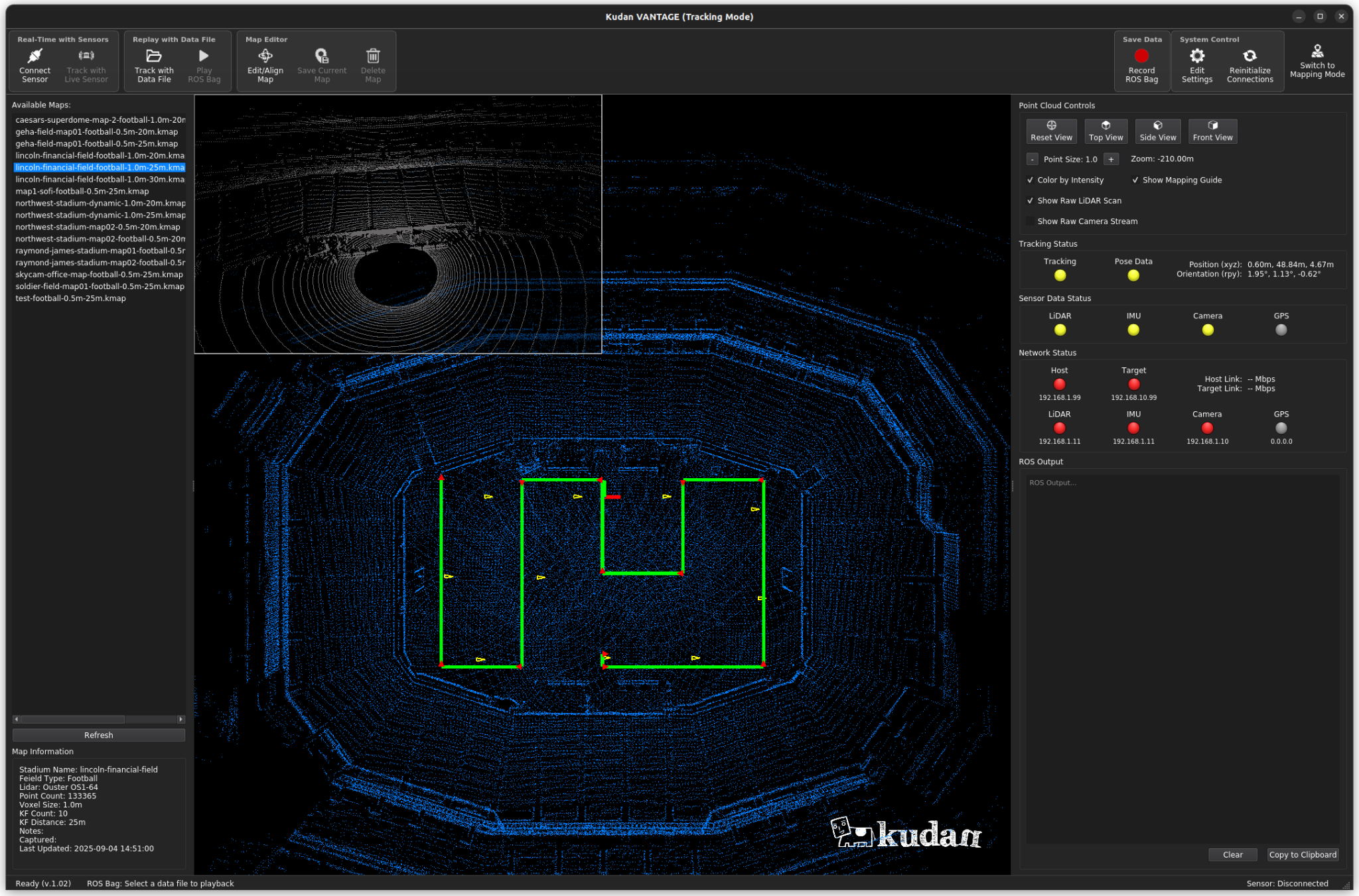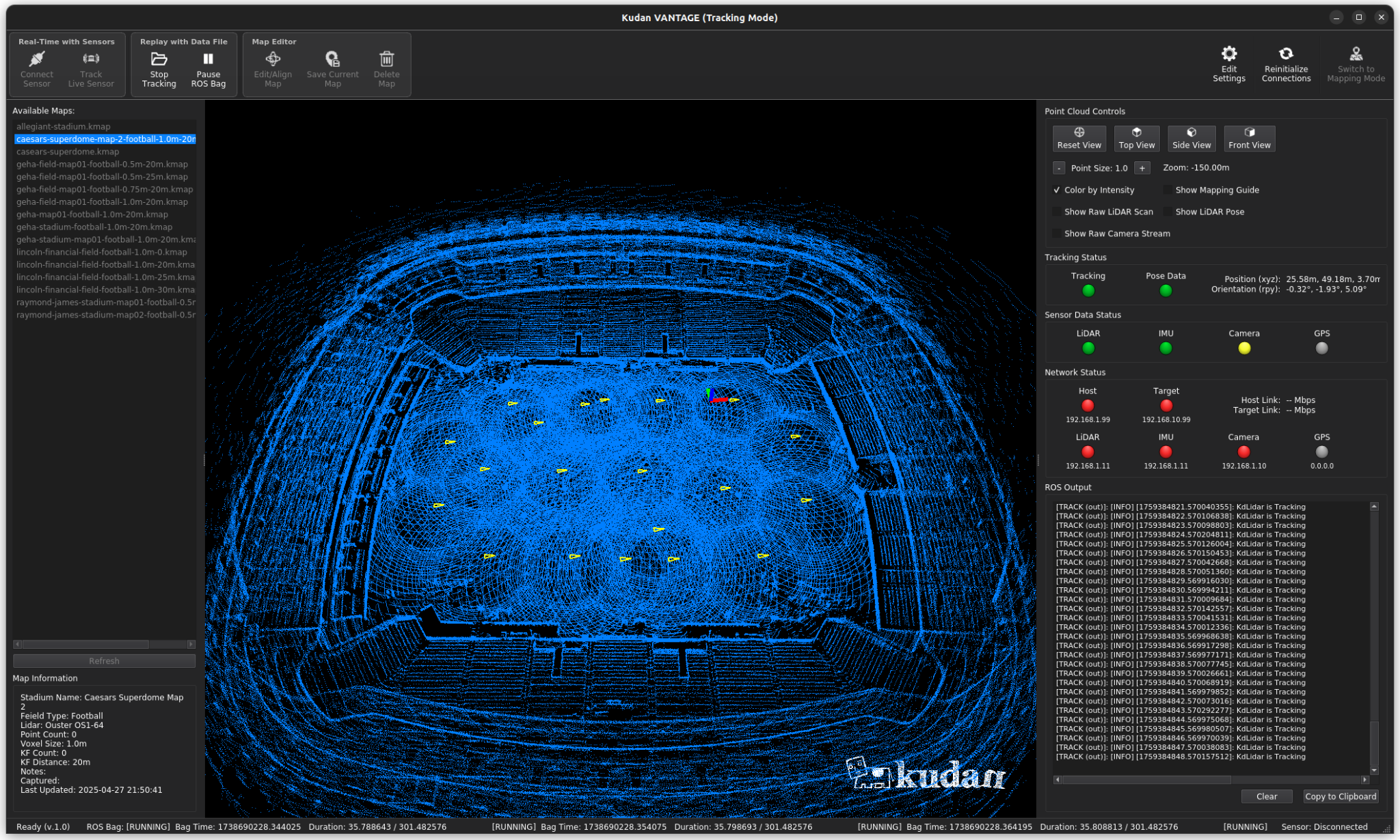 Kudan独自のSLAMアルゴリズムと特許取得の高周波数センサーフュージョン技術を活用し、3D LiDARとIMUを組み合わせて最大59.94Hzの安定したポーズ更新を実現。ライブ放送に求められる精度・低遅延要件に対応します。